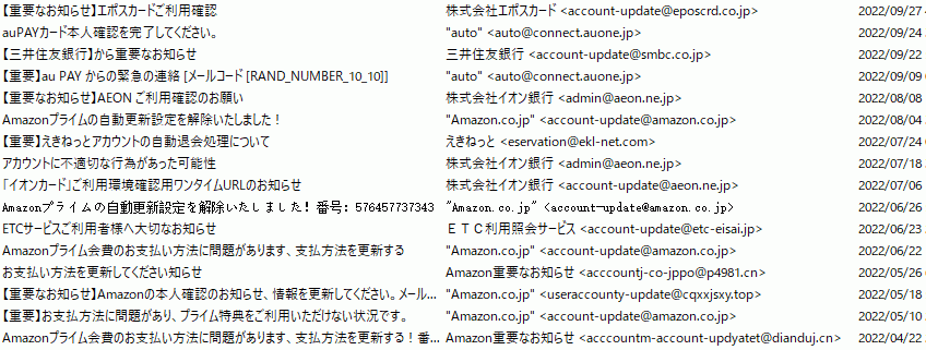 なかなか楽しいw。日本なら、タイムゾーンは+0900。上の詐欺メールリストは、すべて+0800。やばめの海外通販を使ったりするアカウントではないので、【ヘッダに +0800 が含まれていたら、ゴミ箱へ】という振り分け条件を設定しておけば、今のところは手間いらずでゴミ捨てが出来ている。唯一、正規のメールがゴミ箱へ落ちるので、例外設定が必要なのが、「ポストペット銀行」。+0800 って、どこへ外注しているんだろう?日本の銀行が、詐欺メールと同じタイムゾーン(中国)でメルマガを送信するって、常識外れ。